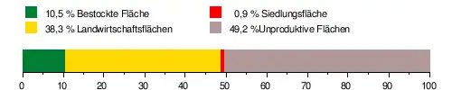 Es besteht zu 10,5 % aus bestockter Fläche, zu 38,3 % aus Landwirtschaftsfläche, zu 0,9 % aus Siedlungsfläche und zu 49,2 % aus unproduktiven Flächen.