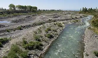 Dem Flussbett im unteren flacheren Teil des Flusses wird Geröll entnommen und in dem direkt am Fluss liegenden Steinberechwerk zu Schotter unterschiedlicher Größe verarbeitet.