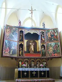 - Die evangelische Kirche[9] wurde 1807 nach dem Einsturz des Mittelschiffs in Folge eines Erdbebens von 1802 neu errichtet und steht unter Denkmalschutz.[8] Die Mauern der Kirchenburg wurden 1895 abgetragen womit die neue Schule und der große Saal errichtet wurden. Der Flügelaltar ist mit seiner Höhe von 4,78 Meter und einer Breite von 7,70 Meter einer der größten Flügelaltäre Siebenbürgens.[3] Die erste Orgel gab es zwischen 1709 und 1785, diese wurde mit einer neuen ersetzt, welche 1802 anlässlich des großen Erdbebens zerstört wurde, 1808 wurde eine neue Orgel eingebaut. Der alte Blasebalg der Orgel wurde 1939 durch ein elektrisches Gebläse ersetzt. Die heutigen Glocken werden seit 1982 elektrisch betrieben und klingen in einem DES-Dur-Geläute.[10]