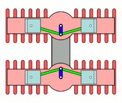 Die Zylinderanordnung hat ein schlechteres Leistungsgewicht als Varianten mit nur einer Kurbelwelle. Für Flugzeuge ist ein auch bei höherer Zylinderzahl flacher und kompakter Motor von Vorteil, die im Vergleich zu Sternmotoren kleine Stirnfläche ergibt einen geringeren Luftwiderstand. Da der gemeinsame Schwerpunkt beider Kolben an einer Kurbel (Kröpfung) immer in der Ebene liegt, die durch die Achsen der Hubzapfen bestimmt wird, lässt sich mit umlaufenden Gegengewichten ein perfekter Massenausgleich realisieren.