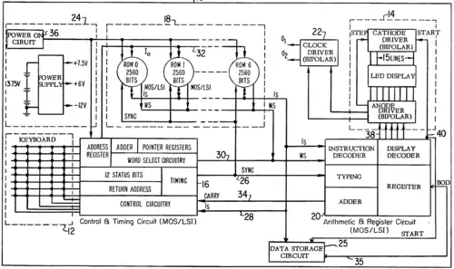 - Die komplette Implementation der arithmetischen, logarithmischen und trigonometrischen Funktionen des HP-35 umfasste 767 geschickt programmierte Befehlsschritte mit einer Befehls-Wortlänge von je zehn Bit (= 7670 Bits). Die drei ROM-Bausteine mit je 256 10-Bit-Worten des bitseriell arbeitenden Rechners sind die mit jeweils zehn Pins versehenen runden Metallgehäuse in der Mitte der Hauptplatine und auch im Blockdiagramm des Taschenrechners als kreisförmige Symbole dargestellt; heute eine ungewöhnliche Bauform für ICs.