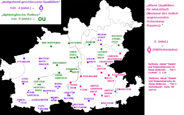 - „offene Qualitäten für mhd. ê/ôe/ô (Merkmal des östlich angrenzenden Hohenloher Raumes, siehe Kt. 52).“[9]