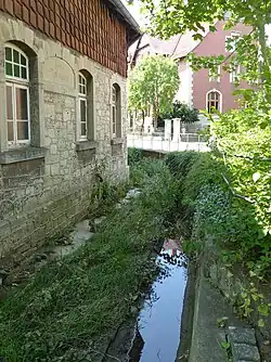 ![]() Die Krumme Beeke als Seitenarm des Hachumer Bachs im Ortskern von Dettum | ||