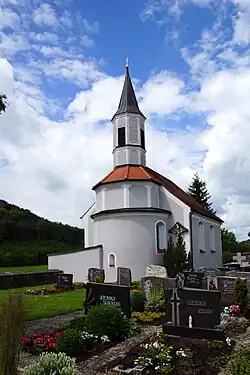 - Die im Kern romanische katholische Filialkirche St. Laurentius ist ein Saalbau mit halbrunder und eingezogener, gestufter Apsis, Chordachreiter, Fußwalm und Vorzeichen. In der ersten Hälfte des 17. Jahrhunderts wurde die Kirche umgestaltet.