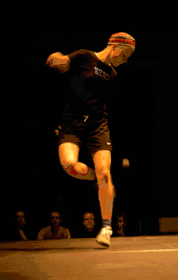 • Mirage: Der Footbag wird mit Fuß A hochgespielt, mit Fuß B umkreist (von innen nach außen) und mit Fuß A wieder aufgefangen.