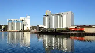 Am Hafen liegen zwei Gleise parallel zum Hafenbecken. Am Ende führen die beiden Gleise wieder zusammen und werden in einem Bogen weg vom Hafenbecken zur im Hafengebiet liegenden Mühle geführt, wo bis zu zehn Wagen entladen werden können. Ein Ausbau der Gleisanlagen ist geplant.[5]