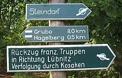 Das alte, heute stark veränderte Hagelbergdenkmal des Bildhauers August Julius Streichenberg, das König Friedrich Wilhelm IV. 1849 eingeweiht hatte, zeigt auf einer von dem Berliner Bildhauer Martin Meyer-Pyritz geschaffenen zentralen Bronzeplatte das Konterfei des preußischen Generals Karl Friedrich von Hirschfeld, der in der Schlacht 3000 preußische Soldaten und die anfangs vielbelächelte märkische Landwehr (Napoleon: Canaille) mit 8500 Mann befehligt hatte. Die Südseite trägt die zweizeilige Inschrift 27. August | Gefecht bei Hagelberg und der auf dem Monument thronende Findling (anstelle der dort ursprünglich befindlichen Borussia) die Gravur der Jahreszahl 1813. Das alte Denkmal folgt nach rund siebenhundert Metern auf der Westseite der Landstraße Richtung Lübnitz auf einem Nebenhügel. Daneben finden sich über die Hügel und das Dorf verstreut verschiedene Wegweiser und Hinweisschilder auf Einzelaspekte der Schlacht wie beispielsweise Rückzug franz. Truppen in Richtung Lübnitz, Verfolgung durch Kosaken oder Schlacht von 1813, Friedhofsmauer und 8500 Landwehrmänner (meistens Bauern) griffen von hier aus am 27.8.1813, 14.00 Uhr an.