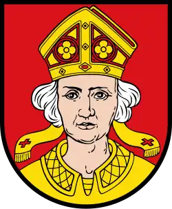 Blasonierung: „In Rot das Brustbild eines hersehenden, silbern behaarten Bischofs mit rot verzierter goldener Mitra und goldenem Gewand.“[21] |