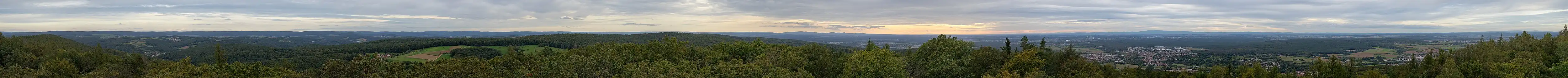 - nach Süden auf das Maintal, die Kahler Seenplatte, Kahl am Main, Karlstein a.Main, Seligenstadt; weiter ist der Odenwald mit dem Melibokus (517,4 m) in 52 km Entfernung zu erkennen,