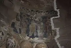Aus der ersten Bauphase blieb ein Bereich mit Fresken in der Apsis mit Heiligenfiguren vor blauem Hintergrund erhalten. In der Kuppelmitte ist ein großes Gemmenkreuz in einem Medaillon mit hellem Sternenhimmel abgebildet. Eine dunkle Kreisscheibe weiter unten könnte den Mond darstellen. Am unteren Rand der Kuppelausmalung im Osten ist eine stehende Figur erkennbar, wohl der Prophet Elija bei der Himmelfahrt. Eine derart hervorgehobene Darstellung des Kreuzes ist eine Besonderheit georgischer Kirchen und hebt zusammen mit der Elija-Szene die Bedeutung hervor, die in der georgischen sakralen Kunst der Auferstehung Jesu von den Toten beigemessen wird.[9]