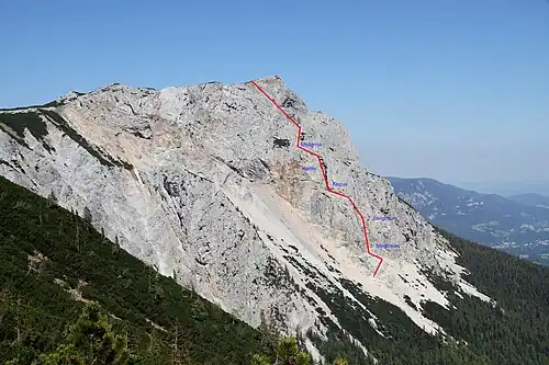 Südwestansicht der Preinerwand mit grobem Streckenverlauf des Haid-Steiges