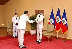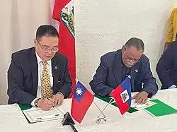 Haiti unterhält eine Botschaft in Taipeh[5] und Taiwan hat eine entsprechende Botschaft in Pétionville, Port-au-Prince.[6][7] Anfang September 2024 übernahm Botschafter Hu Cheng-hao (胡正浩), der dieses Amt bereits von Mai 2017 bis August 2019 innehatte, die Leitung der Botschaft Taiwans in Haiti, während wegen der angespannten Sicherheitslage die meisten fremden Missionen im Land ihr Personal abgezogen hatten.[8] Hu übergab am 19. September 2024 sein Beglaubigungsschreiben an den amtierenden Vorsitzenden des Übergangsrats, Edgard Leblanc Fils.[9]