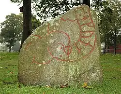 Der Runenstein Sm 76 in Komstad in Småland gefunden ist heute ein Fragment, aber bevor er zerstört wurde, ist der Text von Runologen dokumentiert worden. Das Fragment wird im Garten des Gasthauses von Komstad in Småland aufbewahrt.