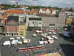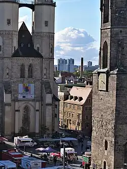 Die erste urkundliche Erwähnung datiert auf das Jahr 806.[7] Mit den durch August Hermann Francke 1698 gegründeten Franckeschen Stiftungen gilt Halle als Ausgangspunkt der sozial-humanistischen Bildung in Deutschland. Halle ist die einzige deutsche Großstadt mit über 200.000 Einwohnern, die im Zweiten Weltkrieg nicht großflächig zerstört wurde, so dass ihr städtebaulich-denkmalpflegerischer Gesamtzustand im Vergleich als einzigartig gilt.[8]