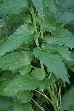 Die Grundblätter sind lang gestielt und herzförmig. Die Blattspreite sind etwa so lang wie breit und grob doppelt gezähnt. Die wechselständigen Stängelblätter sind etwas kleiner, wobei die obersten lanzettlich sind mit mehr oder weniger voll entwickelter Blattspreite. Die mittleren Stängelblätter sind an der Basis herzförmig oder abgerundet.[1]