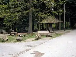 11. Mischbestand aus Großer Küstentanne und Purpur-Tanne, entlang des Baches Chinesisches Rotholz sowie Berg-Hemlocktanne, Nikko-Tanne und Veitchs-Tanne am Gegenhang