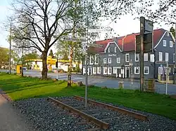 Heute erinnert ein altes Gleisstück mit einem Richtungsschild der Partnerstädte Wuppertals an die Stelle, an der die Burgholzbahn früher hielt.