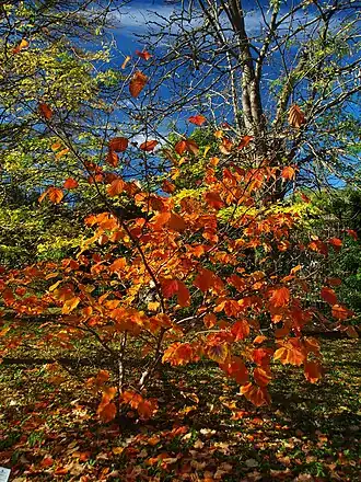 Die Laubblätter sind bei einer Länge von 10 bis 15 cm[2] und einer Breite von 5 bis 10 cm eiförmig bis verkehrt-eiförmig mit schief herzförmigem Spreitengrund und buchtig gezähntem Blattrand[2]. Die leuchtend grünen Laubblätter verfärben sich im Herbst leuchtend gelb, orangefarben bis dunkelrot[3][2]. Auf der Blattunterseite sind die Blattadern leicht behaart.[1]