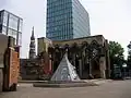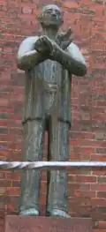 1979, die Plastik von Fritz Fleer steht an der Außenfassade der St. Petri-Kirche und stellt den 1945 hingerichteten Theologen Dietrich Bonhoeffer in Häftlingskleidung und mit gefesselten Händen dar.