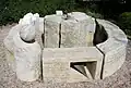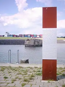 2006, Mahnmal nach einem Entwurf von Anja Bremer und Beate Kirsch, Denkmalsanlage mit künstlerischen Elementen und mehreren Informationstafel bei den freigelegten Fundamentstreifen des U-Boot-Bunkers.
