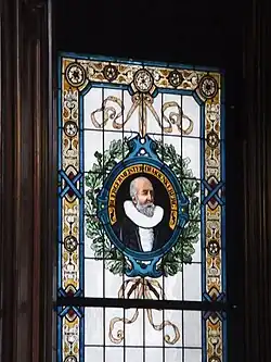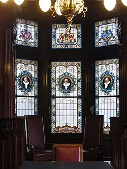 Für das Bürgermeisteramtszimmer schuf der Münchner Glasmaler Gustav van Treeck 1897 nach eigenen Entwürfen die Dreiviertelporträts der drei Bürgermeister Johannes Versmann, Johannes Christian Eugen Lehmann und Johann Georg Mönckeberg (Politiker, 1839) mit deren Familienwappen und ihren Wahlsprüchen. Diese Fenster wurden durch den Krieg vernichtet.[30] Anlässlich der Renovierung des Hamburger Rathauses zum Jubiläum 1997 wurden diese Fenster nach einem alten Foto durch das Hamburger Glaskunstatelier Hempel rekonstruiert.[31][32]