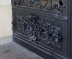 Das prächtige schwarze Eingangsportal mit üppigem Rankenwerk und verknäuelten Rosetten und Figuren ist ein Zeugnis der Kunstfertigkeit des Hamburger Kunstschmiedehandwerks.