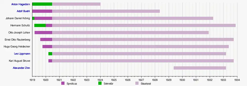 Vom alten Senat wurde auch das Prinzip der nicht stimmberechtigten Senatsmitglieder übernommen. 1919 wurden noch die alten Amtstitel Senatssekretär und Syndicus für die Staatssekretäre verwendet. Dieses althergebrachte Vorgehen wurde mit dem 24. Juni 1920 reformiert: alle nicht stimmberechtigten Senatsmitglieder erhielten den neugeschaffenen Rang des Staatsrates. Im Folgenden sind die einzelnen Staatsräte dargestellt.[4]