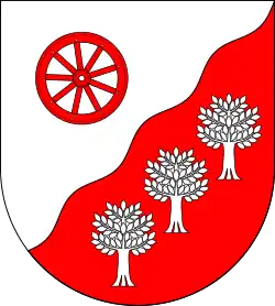 Blasonierung: „Von Silber und Rot im Wellenschnitt schräglinks geteilt. Oben ein rotes Wagenrad, unten drei silberne Laubbäume.“[4]