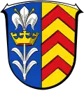 Blasonierung: „Im gespaltenen Schild rechts in Blau eine unterhalb der Blüte goldgekrönte, silberne Lilie mit goldenen Blütenstempeln, links in Gold drei rote Sparren.“[21]