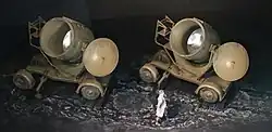 1. Lichtintensität und Photodetektoren: Im Experiment wird das Licht einer Quelle, z. B. eines Sterns, gleichzeitig auf zwei räumlich getrennte Teleskope geleitet. Bei den Empfängern handelte es sich um ausgemusterte Parabolspiegel von 150-cm-Flak-Scheinwerfern, die das Licht der Sterne in ihrem Brennpunkt bündelten. Der Photomultiplier »RCA 6342A« wurde an der Stelle montiert, an der sich ursprünglich die Lampe des Scheinwerfers befand[2]. Die Spiegel bündelten das Sternenlicht und lenkten es auf die Detektoren. Die Lichtintensität wurde an beiden Detektoren gemessen und die Korrelation der Detektorsignale analysiert.