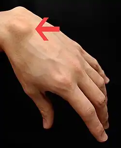 Das Handgelenksganglion ist bei weitem die häufigste gutartige Schwellung (Tumor) des Handgelenkes. Meist sind Frauen mit hyperlaxem Bandapparat zwischen dem zwanzigsten und vierzigsten Lebensjahr betroffen.[1] Untersuchungen gehen davon aus, dass das Neuauftreten (Inzidenz) von Handgelenksganglien in der Allgemeinbevölkerung 0,01 bis 0,08 Prozent beträgt.[4] Die Verbreitung (Prävalenz) von Handgelenksganglien wird grob auf 0,14 Prozent geschätzt.[5] Da ein Handgelenksganglion nicht immer Beschwerden verursacht, ist davon auszugehen, dass es häufiger vorkommt, als durch Studien belegt.