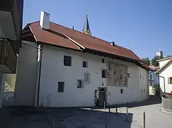 Kunsthistorisch besonders interessant sind die Fresken neben der Eingangstür, die aus der Zeit um 1520 stammen. Das linke, kleinere Fresko zeigt die Mutter Gottes in einem Kielbogen. Das rechte, größere Wandgemälde bringt im Zentrum den gekreuzigten Christus. Darüber ist Gottvater über dem Himmelstor, umgeben von Engeln, dargestellt. Zu beiden Seiten des Kreuzes erkennt man links Maria, rechts Eva, sowie links die allegorische Figur der Ecclesia und rechts der Synagoge. Direkt unterhalb der Maria sind die Symbole der Evangelisten und ein Spruchband zu erkennen. In der untersten Ebene, unterhalb des Kreuzes, sind Engel mit Lanzen in Händen dabei die Vorhölle mit den armen Seelen zu erstürmen. Das mehrteilige Bild wird zudem von vier großen Heiligenbildern umgeben, die auf der linken Seite oben den Apostel Johannes, unten den heiligen Florian und auf der rechten Seite oben den Apostel Bartholomäus und unten den heiligen Georg zeigt.