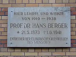 Am 1. Juni 1941 zwischen 4:20 und 7 Uhr morgens erhängte sich Hans Berger infolge einer Depression[3] im Südflügel II der Medizinischen Klinik in Jena. Er wohnte zuletzt im Sanatorium für Nervenkranke in Bad Blankenburg, dessen Leiter er war. Er wurde in Jena begraben.[4] 1940 wurde Berger dreimal, bei insgesamt 65 Nennungen, für den Nobelpreis nominiert und die beiden anderen Vorschläge 1942 und 1947 wurden aufgrund seines Todes nicht mehr evaluiert.[5]