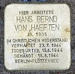 Von Haeften gehörte seit 1933 der Bekennenden Kirche an und wurde stark von der Berneuchener Bewegung geprägt. Vor allem durch die Diplomaten Ulrich von Hassell und Adam von Trott zu Solz hatte er Kontakte zum Kreisauer Kreis. Das auf Hitler geplante Attentat lehnte er aus religiös-moralischen Gründen ab, unterstützte aber den Versuch des Umsturzes und stand bereit, für die Verschwörer die Macht im Außenministerium zu übernehmen. Er wurde nach dem gescheiterten Attentat vom 20. Juli 1944, bei dem sein jüngerer Bruder Werner von Haeften als Oberleutnant der Reserve und Adjutant Claus Schenk Graf von Stauffenbergs von einem Standgericht verurteilt und im Berliner Bendlerblock erschossen worden war,[4] am 23. Juli verhaftet. Am 15. August stand er vor dem Volksgerichtshof und bezeichnete Adolf Hitler als den „großen Vollstrecker des Bösen“. Hans Bernd von Haeften wurde zum Tode verurteilt und noch am selben Tag in Plötzensee gehängt.