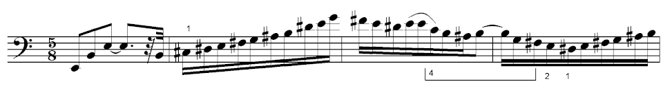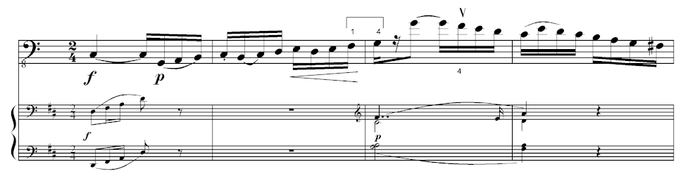 Beginn der Konzert-Etüde: Die Kontrabass-Stimme ist in C-Dur notiert. Die vom Solisten gegriffenen Töne erklingen aufgrund der Solostimmung tatsächlich in D-Dur, wie man an der Klavierbegleitung erkennen kann.