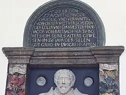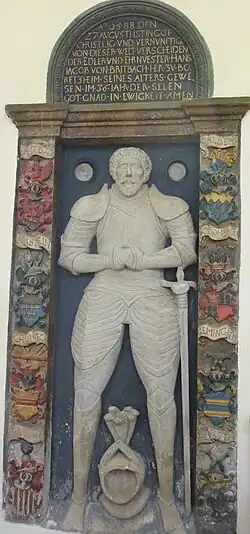 „ANNO 1588 DEN 27. AUGUSTI IST IN GOT CHRISTLIG UND VERNUNFTIG VON DIESER WELT VERSCHEIDEN DER EDLER UND EHRNVESTER HANS JACOB VON BRITBACH HER ZU BORETZHEIM SEINES ALTERS GEWESEN IM 36. JAHR DER SELEN GOT GNAD IN EWIGKEIT, AMEN.“