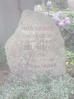 Krüger wurde gegen Ende des Zweiten Weltkrieges in seinem Haus Am Schülerheim 10 in Berlin-Dahlem von sowjetischen Soldaten erschossen[1]. Sein Grab befindet sich auf dem Waldfriedhof Dahlem in Berlin.