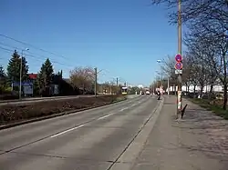 - Hansastraße 203 (und nicht amtlich 204): Während an der Nordseite Grundstück 203 besteht, fehlt an der Südseite eine Grundstücksnummer zwischen 202 und 206. Diese Grundstücke und die als Trasse im Plan eingetragene Fläche nach beiden Seiten liegt bereits im Ortsteil Alt-Hohenschönhausen. Hier ist die Querung der Industriebahn verloren, die seit 1910 über die (damalige) Falkenberger Straße führte.[49] Mit den Straßenbauarbeiten zur Hansastraße wurde am 22. Januar 1985 die Verbindung unterbrochen. Das Bahnende lag seitdem ein Stück östlich der Piesporter Straße.[50] Bis zum Abriss der Gleise – sie lagen zwischen Falkenberger Straße 123 zu 124 (Nordseite) sowie gegenüber 76 und 77 – lief neben dem Hauptgleis noch ein (200 Meter) Anschlussgleis über die Straße, das 30 Meter südlicher abzweigte (entsprechend 204).[51]