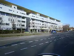 - Hansastraße 52–112 (gerade, östlich, fünf Wohnblöcke), Hansastraße 65–149 (ungerade, westlich, Wohnblöcke und Einzelhäuser), dazu am Ende der Hansastraße-Seitenast die Einzelhäuser Hansastraße 106a–106d und der kammförmige Wohnblock 108a–108f, letztere in einem Weißenseer Geländezipfel[39] zwischen Orankestrand (am Orankesee anschließend) und dem Eck Hansastraße zum Orankeweg.[40] Diese Wohnhäuser sind weitere anzumerkende Bauwerke neben denen um die Buschallee. Diese liegen auf dem Geländestreifen westlich vom Orankesee an das St. Joseph-Krankenhaus, der als landwirtschaftlich genutzter „Kirchenacker“ bis Ende der 1970er Jahre den Südrand der Kniprodeallee (in Höhe Norden des Friedhofs)[41] bildete. Die Wohnblöcke östlich der Straße entstanden noch als Typenbauten von 1988 über die politische Wende hinweg, westlich der Straße nach der Wende als „Wohnquartier Weißensee“ vermarktet stehen Wohnblöcke in freie Architekturen des sozialen Wohnungsbaus die 1994 fertiggestellt waren. Zwar ist amtlich nur ein Straßenverlauf von der östlichen Hansastraße ab am Süden des Quartiers als Hansastraße geführt, dennoch finden sich mehrere unter diesem Namen geführte Privatstraßen als Zufahrtsweg zwischen den Blöcken.