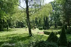 - Zwischen Hansastraße, Buschallee und Orankestrand erstrecken sich die 1926 angelegten Kleingartenanlagen ‚Sonnenschein‘ (Hansastraße 172a) und ‚Zur freien Stunde‘ (Hansastraße 164a), die komplett als Gartendenkmale ausgewiesen sind.[42] Diese Kleingärten liegen hinter den vier Wohnblöcken mit der Hausnummer Hansastraße 150–172.