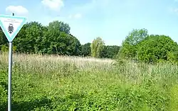 - Hansastraße 179 und die folgenden: Der Einmündung der Giersstraße (mit dem Eckgrundstück Giersstraße 2) folgt das aus der Falkenberger Straße 51 (vormals: 25 m × 80 m) ausgegliederte Grundstück Hansastraße 179 und 179a. Das vor dem Ausbau der Hansastraße vorhandene bebaute Grundstück Falkenberger Straße 54 fehlt seither, es verblieb eine trapezförmige umzäunte Fläche. Daran anschließend besteht der Wendeplatz der Busse (Linien 156 und 259, Stand: 2015) an der Nordwestseite der Hansastraße (vormals: Falkenberger Straße 141). Es fehlt die Nummerierung der Hansastraße (Nrn. 181–185) bis an die Neubauhäuser Liebermannstraße 185 und 202, die entlang der Hansastraße stehen. Nach der Liebermannstraße folgt regulär gezählt 187 folgende (ungerade). Zwischen Buswendeplatz und den Häusern Liebermannstraße liegen 200 Meter unbebaut „wildes“ Busch-/ Baumland geschützt mit einem Zaun an der Straße,[45] das Schutzgebiet „GLB Teich Hansastraße“.[46][47] Das Gewässer steht auf dem Plan von 1907 als Grünfläche markiert und nach diesem mit dem Faulen See in Verbindung.