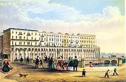Schon im Stadtbuch von 1276 wurde Rittern das Wohnen innerhalb der Wälle Hamburgs untersagt.[34] Bis 1860 galt das Verfassungsverbot des Erwerbs von innerstädtischen Grundstücken durch Adelige in Hamburg. Umgangen wurde das Verbot, indem Hamburger Bürger als Strohmänner für Adelige als Erwerber auftraten, beispielsweise 1757 für das Palais des späteren Grafen Heinrich Carl von Schimmelmann.