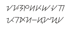 Das Schriftsystem besteht aus drei Vokalen und dreizehn Grundzeichen. Letztere bestehen je aus einem Konsonanten, dem stets ein Vokal folgt.