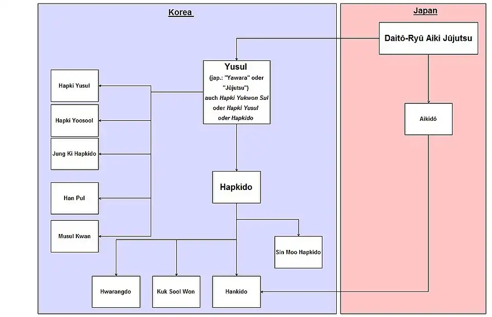 Die ursprüngliche Kampfkunst von Choi Yong-sul unterschied sich also – wenn überhaupt – nur gering vom Daito-Ryu. Sie wurde durch Ji Han-jae und Kim Moo-hong „koreanisiert“. Hierdurch entstanden zwei Hauptlinien des Hapkido: Die eine geht auf Choi zurück, die andere auf Ji. Seit den späten 1950er machten sich viele Schüler von Choi Yong-sul und Ji Han-jae mit eigenen Schulen selbständig. Viele der Schulen unterschieden sich nur wenig voneinander und heute noch gibt es viele Stile, die sich sehr ähneln.