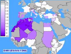 E1b1b1b (E-M81): M81, die Hauptsubgruppe von E1b1b, ist in Nordafrika besonders auf Berber und arabische Bevölkerungen dieser Region konzentriert. M81 wird auch, obwohl bei niedriger Dichte von 1,6 bis 4 %, auf der Iberischen Halbinsel gefunden. Cruciani schreibt seine Anwesenheit in Spanien einer modernen Migration der M81 tragenden Völker des Maghreb zu. Möglicherweise stimmt sie mit der islamischen Eroberung von Spanien überein.