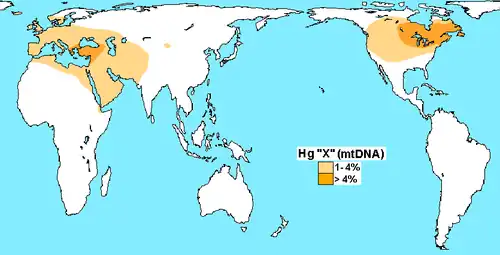 - ↑ Michael D. Brown et al. mtDNA Haplogroup X: An Ancient Link between Europe/Western Asia and North America?, American Journal of Human Genetics, 63, 1852-1861 (1998)