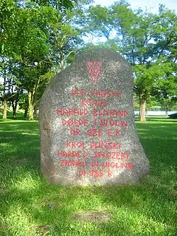 Deutsch: „König Harald gebot, dass dieses Denkmal seinem Vater Gorm und seiner Mutter Tyra gemacht wurde; der Harald, der sich ganz Dänemark und Norwegen unterwarf und die Dänen zu Christen machte.“