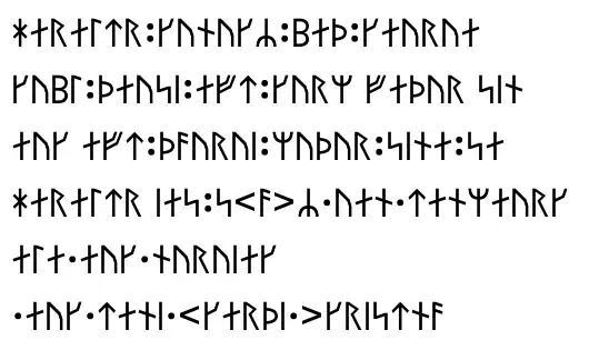 | ᚼᛅᚱᛅᛚᛏᚱ᛬ᚴᚢᚾᚢᚴᚱᛣ᛬ᛒᛅᚦ᛬ᚴᛅᚢᚱᚢᛅ | haraltr:kunukṛ:baþ:kaurua | „Haraldr konungr bauð gjöra“ |