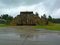 (MiG-Shelter Typ GDF, links 1 × offen, rechts 2 × geschlossen, ganz rechts Munitionsbunker)