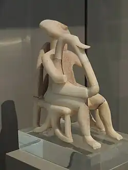 Die kykladischen Bildhauer haben außer zahlreichen nahezu aufrechten weiblichen Figurinen eine kleine Anzahl von dreidimensionalen Sonderformen geschaffen, stehende Einzelfiguren oder Figurengruppen auf Standplatten und sitzende Idole auf einfachen Schemeln oder seltener Stühlen. Sitzende weibliche Idole sind mit untergeschlagenen Armen dargestellt, männliche mit ausgestreckter Hand und einen Gegenstand haltend, wie der sogenannte „Zecher“ oder die bekanntere Gruppe von Harfenspielern. Darstellungen von musizierenden Idolen sind selten, die Gruppe der Harfenspieler wird als frühester Nachweis des Saitenspiels im ägäischen Raum angesehen.[3] Ihre Echtheit wurde von manchen Autoren angezweifelt.[4] Von den 14 in Museen oder Privatsammlungen befindlichen Harfenspielern wird die Herkunft von 6 als gesichert angesehen.[5] Harfenspieler wurden über einen Zeitraum von etwa 250 Jahren gefertigt.[6]